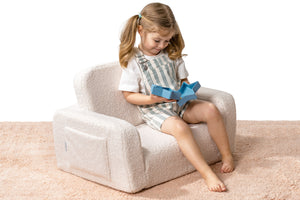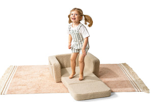 Lumi is a 2-in-1 chair that transforms into a soft nap mat. Designed for everyday play, rest, and quiet time — with washable fabric and safe materials.