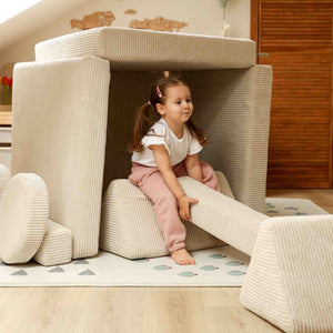 A modular play sofa that grows with your child. Build a sofa, a castle, a slide base - or a seamless play mat. Designed by parents in the EU, loved by families across Europe.