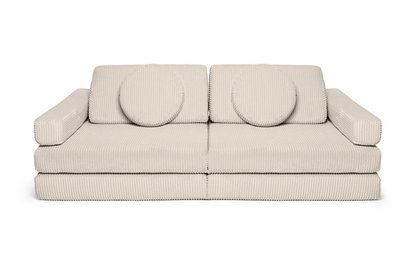 A modular play sofa that grows with your child. Build a sofa, a castle, a slide base - or a seamless play mat. Designed by parents in the EU, loved by families across Europe.